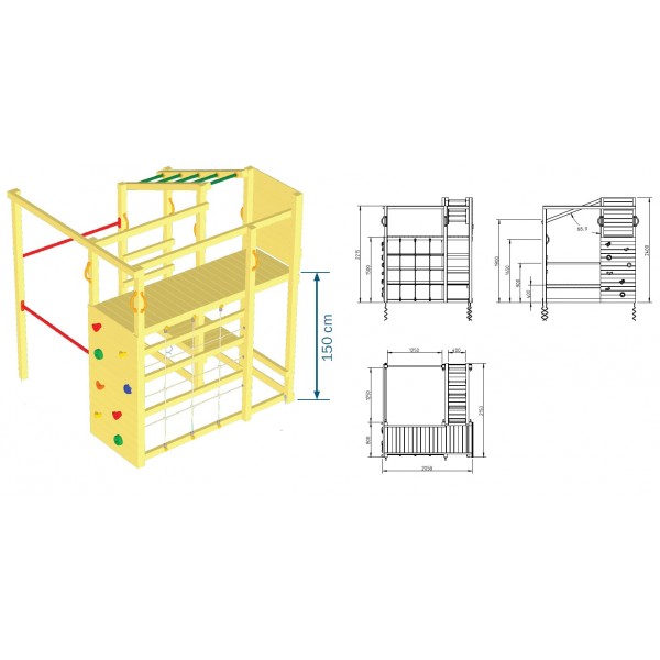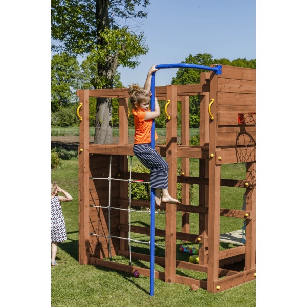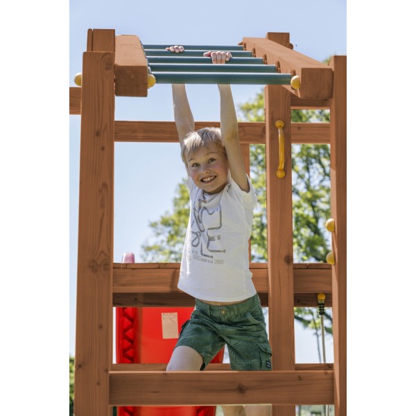 Turnul este echipat cu un perete de catarare prevazut cu pietre de escalada, care ajuta la dezvoltarea coordonarii, fortei si increderii in sine. In pachet sunt incluse si manerele de siguranta, plasa, barele de sustinere si toboganul, astfel incat structura este gata pentru utilizare imediata dupa montaj.