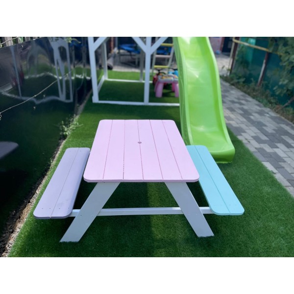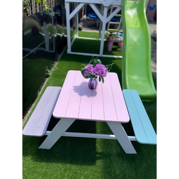 Masuta de picnic este potrivita pentru utilizare in exterior si poate fi integrata cu usurinta in diferite spatii de joaca sau gradini.