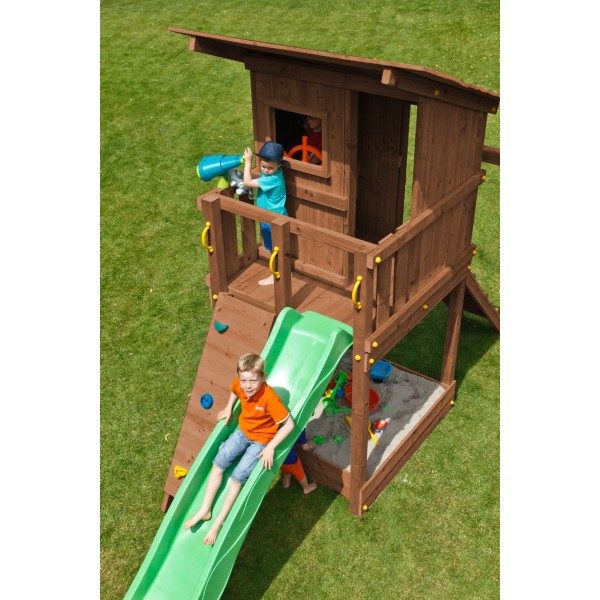 Pachetul include materialul lemnos taiat la dimensiunile specifice produsului, organele de asamblare, manerele de siguranta, ancorele pentru fixare in pamant si toboganul, astfel incat turnul este gata de utilizare dupa montaj. Accesoriile si modulele suplimentare din imaginile de prezentare nu sunt incluse si au rol strict informativ.