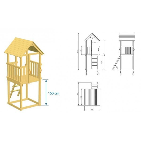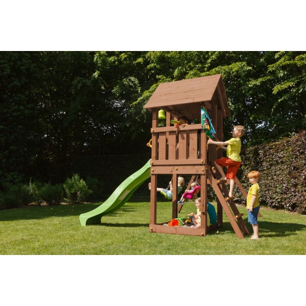 Pachetul include materialul lemnos taiat la dimensiunile specifice produsului, organele de asamblare, manerele de siguranta, ancorele pentru fixarea in pamant si toboganul, astfel incat turnul este complet functional dupa montaj. Accesoriile si modulele suplimentare care apar in imaginile de prezentare nu sunt incluse si au rol strict informativ.
